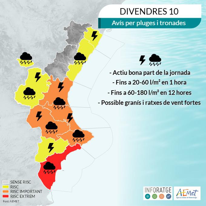 El aviso estará vigente desde las 10:00 horas del viernes 10 de octubre hasta las 23:59 horas del mismo día, debido al riesgo extremo de lluvias intensas que podrían superar los 180 litros por metro cuadrado en pocas horas.