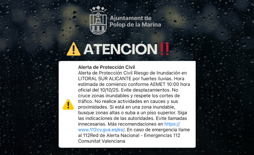 Desde el Ayuntamiento de Polop de la Marina se recuerda a toda la población la importancia de extremar las precauciones y seguir únicamente la información procedente de fuentes oficiales, como la AEMET, el Centro de Coordinación de Emergencias (112CV) y los canales institucionales del propio Ayuntamiento.