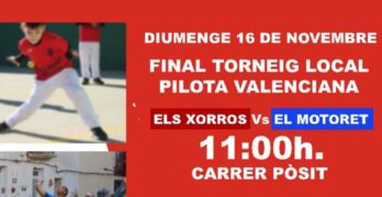 FINAL DEL TORNEO LOCAL DE PILOTA VALENCIANA, PRESENTACIÓN ESCUELA Y HOMENAJE. ESTE DOMINGO 16 DE NOVIEMBRE.