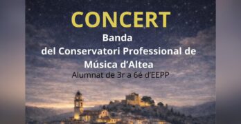 [val] CONCERT BANDA DEL CONSERVATORI PROFESSIONAL DE MÚSICA D'ALTEA Alumnat de 3r a 6é d ´EEPP Divendres 23 de gener 19.00 h. GRATUÏT I PER A TOTS ELS PÚBLICS Auditori Emilio Sagi - Luisa Vela Des de la Regidoria de Leer más