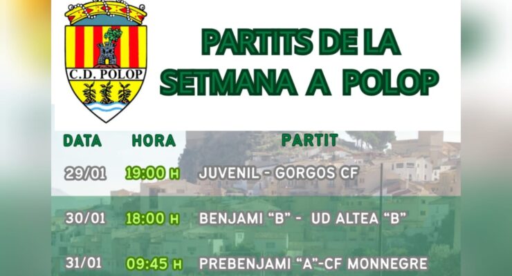 [val] FUTBOL PARTITS D´AQUEST DISSABTE 10 de gener a POLOP del C.D. POLOP al Camp Nou Terol. 09:45 h. Infantil vs CF Alfaz del Pi C 10:00 h. Alevi B vs UD Benissa B 11:15 h. Benjamin B vs Gorgos CF B i dimarts 13 de gener a Leer más