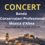 [val] CONCERT BANDA DEL CONSERVATORI PROFESSIONAL DE MÚSICA D’ALTEA Alumnat de 3r a 6é d ´EEPP Divendres 23 de gener 19.00 h. GRATUÏT I PER A TOTS ELS PÚBLICS Auditori Emilio Sagi – Luisa Vela Des de la Regidoria de Cultura, encapçalada per Angela Fuster, i dins de l’Hivern Cultura Polop animem a tot aquellLeer más
