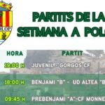 [val] FUTBOL PARTITS 29 de gener al 04 de febrer a POLOP del C.D. POLOP al Camp Nou Terol. 19:00 h.dijous: Juvenil vs Gorgos CF 18:00 h. divendres: Benjamí B vs UD Altea B 09:45 h dissabte: Prebenjamí A vs CF Monnegre 10:45 h dissabte: Benjamí A vs CF Benidorm C 16:30 h dissabte: JuvenilLeer más