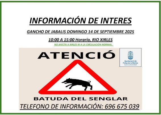 La Sociedad de Cazadores «La Amistad», va a realizar una batida de jabalíes autorizada por la Conselleria de medio ambiente en los parajes de Rio Xirles, el día 14 de septiembre, con el fin de controlar los daños ocasionados por este animal.