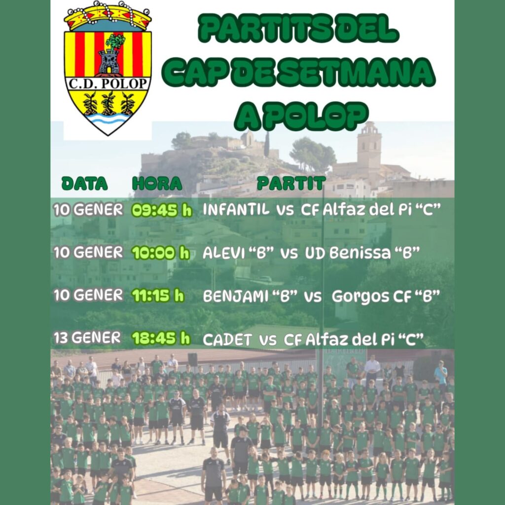 Desde la Concejalía de Deportes, encabezada por Angela Fuster, animamos a todo el que pueda asistir para animar a nuestros equipos locales. Polop siempre con el deporte.