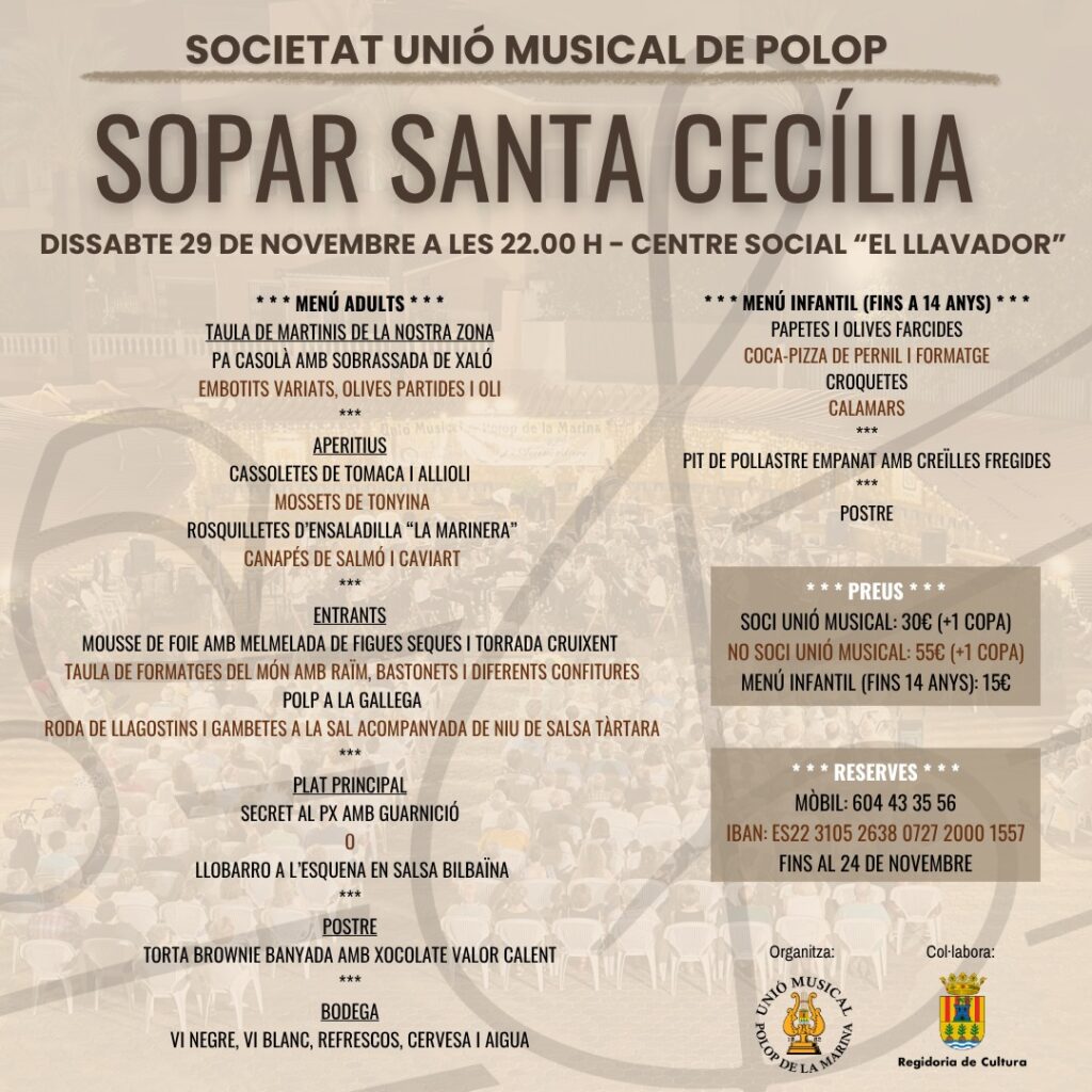 Des de la Regidoria de Cultura, encapçalada per Angela Fuster, animem a tots acompanyar-nos a l´arreplegada dels nous músics, la missa, el concert i el sopar amb reserva prèvia. Polop sempre amb la Cultura.