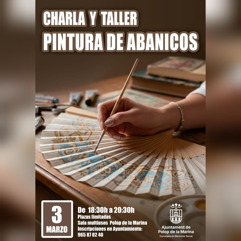 cas.- Dentro de la semana del 8M 💜 organizada por JULIA BAUTISTA, Concejala de Bienestar Social Polop, encontramos esta CHARLA Y TALLER DE PINTURA DE ABANICOS🪭 el próximo martes 📆 3 de marzo en edificio 📍 Multiusos en la 1ª planta a las 🕠18:30 h. de dos horas de duración.